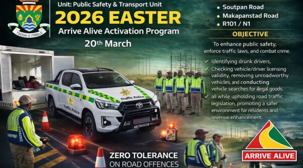 🚨 MORETELE LOCAL MUNICIPALITY SUCCESSFULLY IMPLEMENTS EASTER ARRIVE ALIVE ROADBLOCK OPERATION Moretele Local Municipality, through its Public Safety & Transport Unit, successfully conducted the 2026 Easter Arrive Alive Activation Roadblock Programme across key routes including Soutpan Road, Makapanstad Road and the R101. The operation was executed in partnership with:Makapanstad SAPS | Moeka Vuma SAPS | Bedwang SAPS | Cyferskuil SAPS 🎯 OBJECTIVETo enhance public safety, enforce traffic laws, and combat...Read More